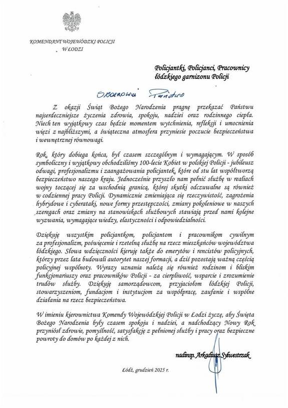 "W imieniu kierownictwa Komendy Wojewódzkiej Policji w Łodzi życzę, aby Święta Bożego Narodzenia były czasem spokoju i nadziei, a nadchodzący Nowy Rok przyniósł zdrowie, pomyślność, satysfakcję z pełnionej służby i pracy oraz bezpieczne powroty do domów po każdej z nich. "