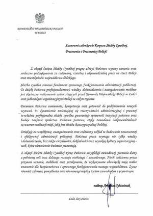 Życzenia Komendanta Wojewódzkiego Policji w Łodzi z okazji Dnia Służby Cywilnej