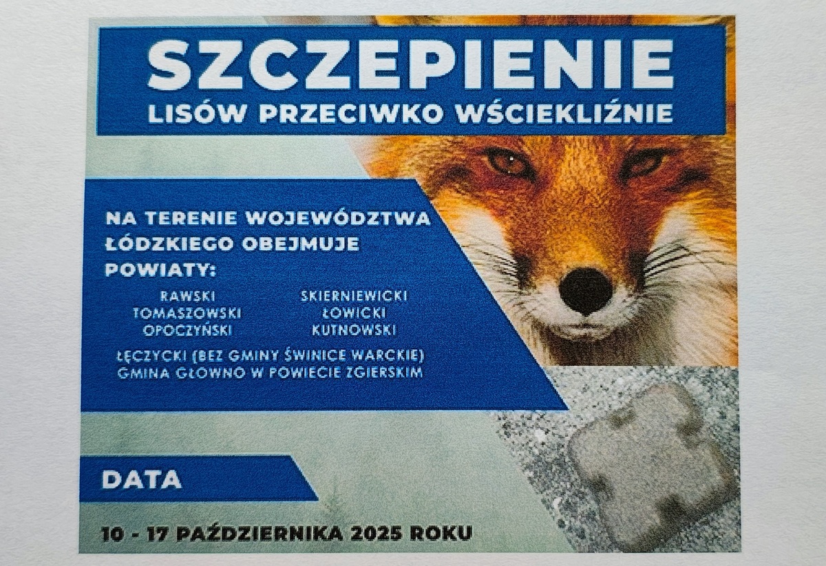 Łódzki Wojewódzki Lekarz Weterynarii zawiadamia, że na terenie województwa łódzkiego w powiecie rawskim, opoczyńskim, tomaszowskim, skierniewickim, łowickim łęczyckim, kutnowskim oraz zgierskim w dniach od 10 do 17 października 2025 roku zostanie przeprowadzone ochronne szczepienie lisów wolno żyjących przeciw wściekliźnie.